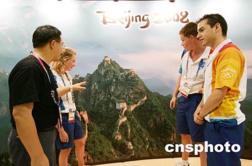 這個(gè)占地七十多平米的大廳設(shè)在雅典奧運(yùn)會(huì)主新聞中心的一層。一幅巨大的長(zhǎng)城圖片成為大廳的主要裝飾,也吸引了眾多參觀者的眼球。本社記者的意外闖入,北京奧運(yùn)會(huì)組委會(huì)新聞宣傳部項(xiàng)目專家陳平笑言:“來(lái)得早,不如來(lái)得巧。北京奧組委的這個(gè)展覽大廳今天剛剛開(kāi)張,還沒(méi)來(lái)得及向媒體透露!彼Q,北京奧組委開(kāi)辦這個(gè)展覽,正是欲借雅典奧運(yùn)的“東風(fēng)”,以達(dá)到宣傳北京和北京奧運(yùn)會(huì)的目的。今天開(kāi)辦的展覽將與本屆奧運(yùn)會(huì)同步結(jié)束。