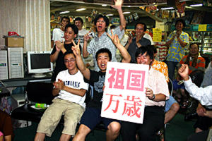 這次活動(dòng)是由大阪的中文報(bào)紙《關(guān)西華文時(shí)報(bào)》策劃組織的,地點(diǎn)在市中心的中華城,數(shù)十名中國(guó)人球迷在鮮艷的五星紅旗下,高舉“祖國(guó)萬(wàn)歲”的標(biāo)語(yǔ)牌,邊觀(guān)看大屏幕電視,邊為中國(guó)隊(duì)吶喊助威的。日本有名的電視臺(tái)每日電視臺(tái)專(zhuān)門(mén)派出了一個(gè)攝制小組進(jìn)行現(xiàn)場(chǎng)采訪(fǎng)。