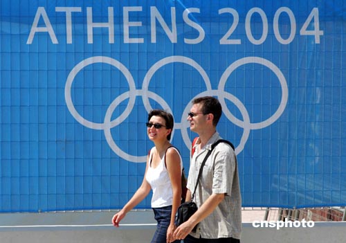 2004雅典奧運(yùn)會(huì)開幕在即,雅典街頭的“奧運(yùn)味道”也越來(lái)越濃。圖為一對(duì)青年男女經(jīng)過(guò)雅典奧運(yùn)標(biāo)志牌。中新社記者:張煒