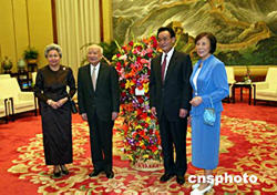 全國人大常委會委員長吳邦國八月九日在北京會見柬埔寨國王諾羅敦·西哈努克(Norodom Sihanouk)及王后。中新社記者:滿會喬