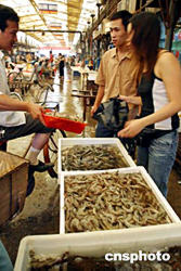 八月十日,鄭州市民在市場購買降價的鮮蝦。由于受到美國“反傾銷”調(diào)查影響,中國廣東、浙江等主要產(chǎn)區(qū)的蝦產(chǎn)品不得不大量轉(zhuǎn)為內(nèi)銷,使內(nèi)地市場供應(yīng)量猛增,河南省蝦價已下跌三成。目前廣東、浙江很多水產(chǎn)品已開始將出口目標(biāo)市場轉(zhuǎn)向歐盟。中新社記者:慎重