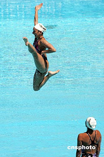 當?shù)貢r間八月十一日上午,日本花樣游泳選手在雅典奧運比賽場進行熱身訓練,動作奇特。中新社記者:毛建軍