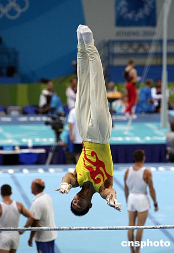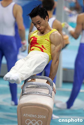 中國(guó)男子體操隊(duì)當(dāng)?shù)貢r(shí)間八月十一日晚上在雅典奧運(yùn)體操比賽館與德國(guó)、日本、烏克蘭隊(duì)進(jìn)行集體合練。中新社記者:毛建軍