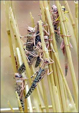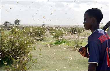 目前這一地區(qū)現(xiàn)在面臨著15年來(lái)最為嚴(yán)重的一次蝗災(zāi),大批的沙漠蝗蟲(chóng)正從西北非侵襲毛利塔尼亞,馬里以及尼日利亞,在這一地區(qū),很多都是依靠農(nóng)業(yè)生活的人。蝗災(zāi)爆發(fā)時(shí),一群群的蝗蟲(chóng)鋪天蓋地,烏云蔽日般東奔西撞,它們所到之處,各種綠色植物均遭暴殄,慘不忍睹。1988年,非洲的塞內(nèi)加爾和毛里塔尼亞境內(nèi),發(fā)生了數(shù)十年罕見(jiàn)的蝗災(zāi),僅一群蝗蟲(chóng)就可達(dá)1000億只以上。