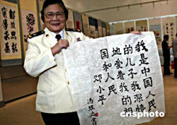 “‘小平同志告訴我們’中國當(dāng)代名人書法大展”八月十二日在北京舉行,各界人士書寫的三百幅以鄧小平名句為內(nèi)容的書法作品與世人見面。馮玉祥將軍之女、女少將、海軍總醫(yī)院原副院長馮理達(dá)展示自己書寫的鄧小平名句。中新社記者:滿會喬