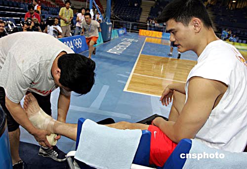 圖為將要在開幕式上擔(dān)任中國奧運(yùn)代表團(tuán)旗手的姚明(右)在訓(xùn)練前接受隊(duì)醫(yī)對其進(jìn)行包裹保護(hù)。