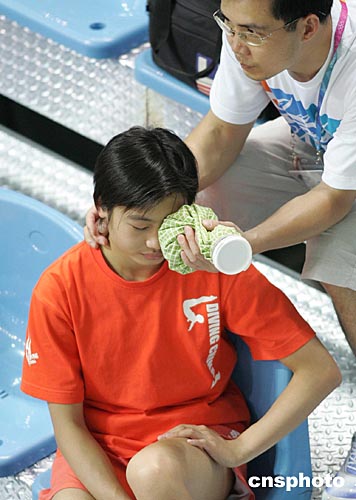 中國跳水女選手勞麗詩當(dāng)?shù)貢r(shí)間八月十二日在雅典訓(xùn)練前,由隊(duì)醫(yī)幫助用冰袋治療眼睛疾患。中新社記者:毛建軍