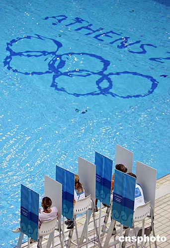 雅典奧運(yùn)跳水比賽館當(dāng)?shù)貢r間八月十二日試驗電子打分系統(tǒng),裁判當(dāng)場打分時將用擋板隔開進(jìn)行獨(dú)立操作。中新社記者:毛建軍
