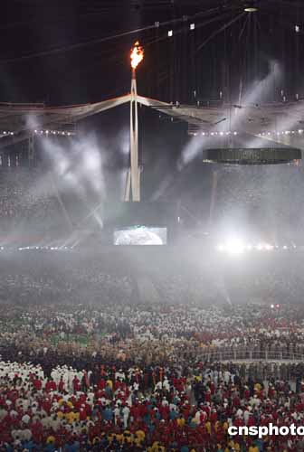 當(dāng)?shù)貢r(shí)間八月十三日晚,第二十八屆奧運(yùn)會(huì)在希臘雅典開(kāi)幕。圖為主體育場(chǎng)奧運(yùn)主火炬被點(diǎn)燃。中新社記者:毛建軍