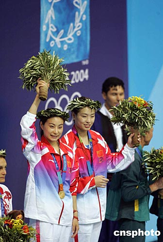 當(dāng)?shù)貢r(shí)間八月十四日晚,郭晶晶與吳敏霞在雅典奧運(yùn)跳水館獲得第二十八屆奧運(yùn)會女子三米板雙人金牌。中新社記者:毛建軍