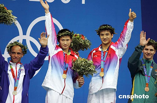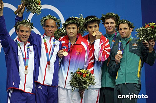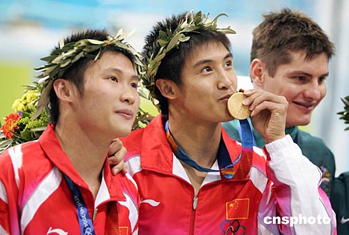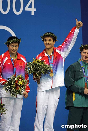 當?shù)貢r間八月十四日晚,中國跳水隊田亮、楊景輝在雅典奧運跳水館獲得男子雙人十米跳臺金牌。中新社記者:毛建軍