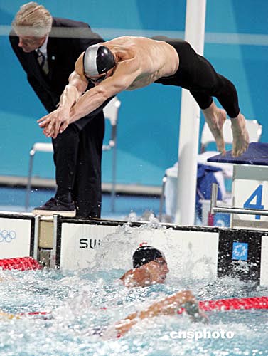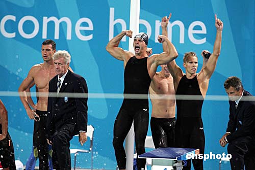 當(dāng)?shù)貢r間八月十五日晚,在雅典舉行的第二十八屆奧運會游泳比賽中,南非選手以三分十三秒一七的成績獲得男子四乘一百米自由泳接力賽金牌。中新社記者:毛建軍