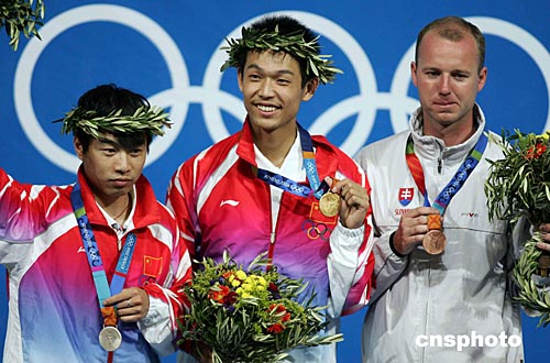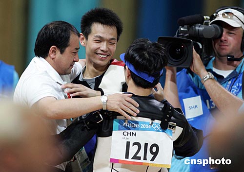 當(dāng)?shù)貢r(shí)間八月十六日,中國(guó)選手朱啟南(左)與李杰在雅典奧運(yùn)男子十米氣步槍射擊比賽中分獲金、銀牌。朱啟南并以七百零二環(huán)的成績(jī)打破世界紀(jì)錄。中新社記者:毛建軍