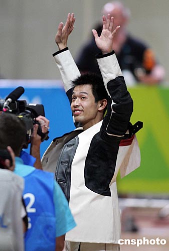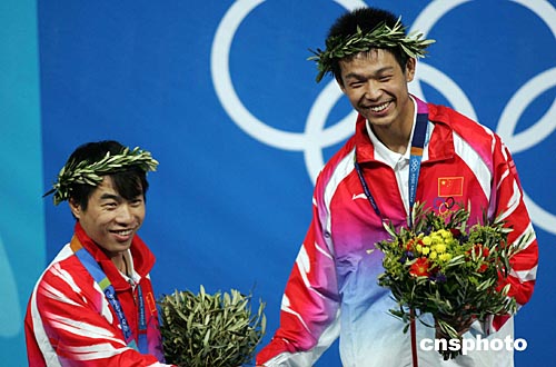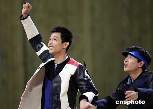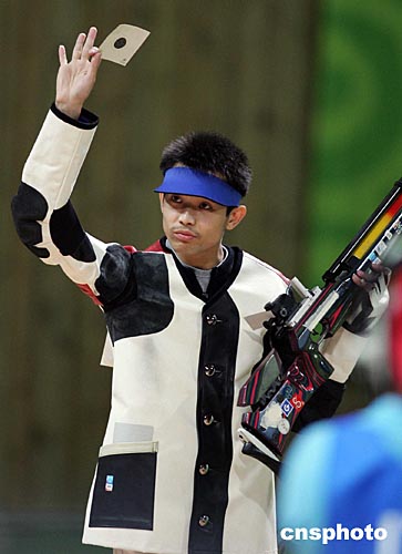 當(dāng)?shù)貢r間八月十六日,中國選手朱啟南(左)與李杰在雅典奧運(yùn)男子十米氣步槍射擊比賽中分獲金、銀牌。朱啟南并以七百零二環(huán)的成績打破世界紀(jì)錄。中新社記者:毛建軍