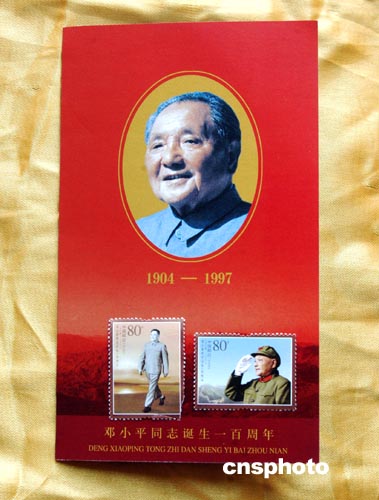 北京市郵票公司為紀(jì)念鄧小平誕辰100周年,并配合國(guó)家郵政局在2004年8月22日發(fā)行《鄧小平同志誕生一百周年》紀(jì)念郵票(1套2枚,小型張1枚),特設(shè)計(jì)印制了這套郵票的首日封、小型張首日封、郵折等郵品,將在8月22日與郵票同時(shí)發(fā)行。兩枚郵票的名稱分別為:中共中央總書記、中共中央軍委主席,面值均為80分。小型張圖案名稱為:改革開(kāi)放和現(xiàn)代化建設(shè)總設(shè)計(jì)師,面值6元。中新社記者:鄒憲