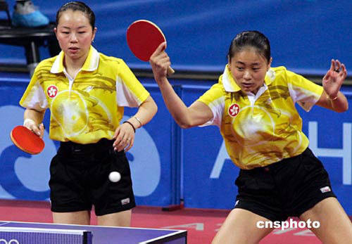 當?shù)貢r間八月十八日,在雅典奧運會乒乓球女雙1/4決賽中,中國香港選手桑亞蟬、帖亞娜被王楠、張怡寧以2:4淘汰。中新社記者:張煒