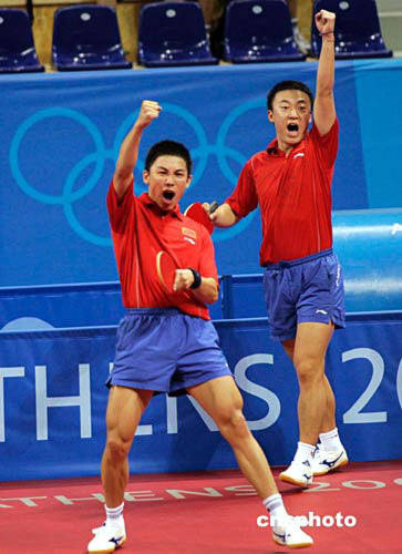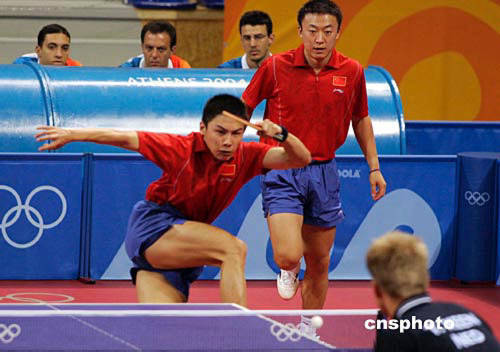 雅典時間八月十八日上午,中國乒乓球男雙搭檔馬琳、陳杞以中4:2戰(zhàn)勝荷蘭選手凱恩、赫斯特爾,晉級奧運(yùn)男雙8強(qiáng)。中新社記者:張煒