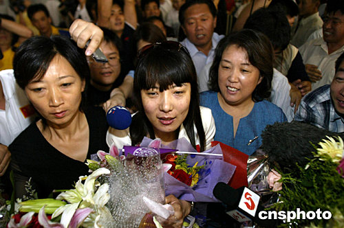 喜獲雅典奧運(yùn)第一金的女子十米氣步槍選手杜麗及教練,十米氣手槍金牌得主、六朝元老王義夫,男子十米氣步槍金牌得主朱啟南以及國家射擊隊(duì)的陶璐娜、任潔等昨天首批載譽(yù)歸國,在首都機(jī)場受到國家體育總局官員和他們的家人以及大批自發(fā)而來的首都群眾的熱情迎接。