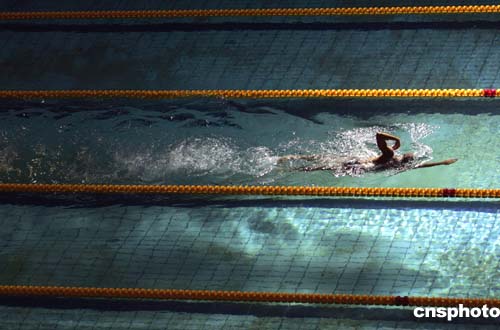 圖為一名參加奧運比賽的游泳運動員在晚上獨自練習(xí)的場景。