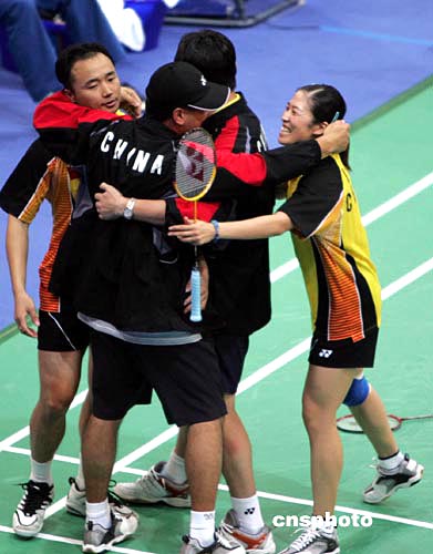 中新社雅典八月十九日電 悉尼奧運會冠軍張軍/高崚今天在奧運會羽毛球混合雙打決賽中苦戰(zhàn)九十三分鐘,以二比一戰(zhàn)勝英國選手羅伯森/埃姆斯,成為第一對在奧運會上成功衛(wèi)冕的羽毛球運動員。