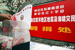 一月四日,上海街頭愛心涌動,市民自發(fā)前往設在各區(qū)的募捐站,為遭受印度洋海嘯襲擊的災民捐款。作者:湯彥俊