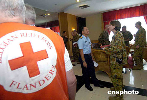 在印度尼西亞棉蘭市參加救援行動(dòng)的國(guó)際救援組織和世界各地記者人數(shù)眾多,令多家星級(jí)酒店爆滿.多個(gè)救援組織在酒店設(shè)立信息交流中心商討拯救班達(dá)亞齊災(zāi)區(qū)事宜.圖為澳洲軍人與印度尼西亞軍方人員交流信息。作者:洪少葵
