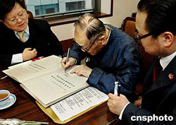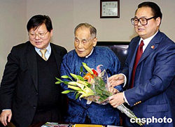 大會主席周茳釤鈞(右)、副主席王錦彪(左),看望香港南洋商業(yè)銀行名譽(yù)董事長莊世平先生,并征求莊老對大會的建議。