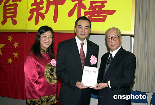 歷經十五年編纂而成的六十萬字的僑史力作《日本華僑·留學生運動史》,日前在東京出版面世。這本凝聚日本僑界心血的歷史專著,填補了在日華僑和留學生史料的大量空白,獲得各界高度評價。圖為該書主編、著名僑領陳焜旺先生(圖右),在八日于東京舉行的日本僑界迎新聯(lián)歡會上,向王毅大使(圖中)和中國駐日本大使館總領事于淑媛(圖左)贈送該書。作者:王健