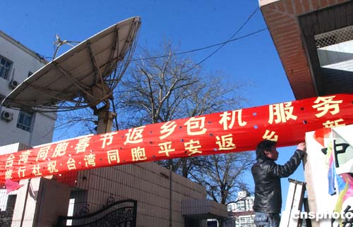 一月十一日,北京一家旅行社正為臺商春節(jié)包機開設(shè)的服務(wù)站做準(zhǔn)備工作。農(nóng)歷春節(jié)日益接近,在大陸的臺灣同胞春節(jié)返鄉(xiāng)包機問題再度浮上臺面。作者:韓藝冰