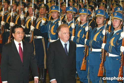 中國國家主席胡錦濤今天在人民大會堂為二〇〇五年到訪中國的第一位外國元首、葡萄牙總統(tǒng)桑帕約舉行歡迎儀式。
