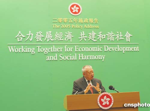 香港行政長(zhǎng)官董建華1月12日在香港立法會(huì)提交2005年施政報(bào)告后,召開(kāi)記者會(huì)回答記者提問(wèn)。作者:鄧慶樂(lè)