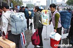 一月十三日,在廣州火車站已陸續(xù)看到外來(lái)民工離粵返鄉(xiāng)過年。盡管春運(yùn)未至,許多及時(shí)領(lǐng)到工錢的民工趁鐵路客運(yùn)高峰還未到來(lái),早早啟程回家。作者:陳文