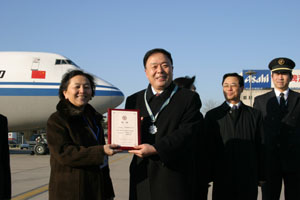 中國(guó)紅十字總會(huì)會(huì)長(zhǎng)當(dāng)即向中國(guó)國(guó)際航空股份有限公司頒發(fā)了“中國(guó)紅十字博愛(ài)”獎(jiǎng)?wù)隆?/p>
