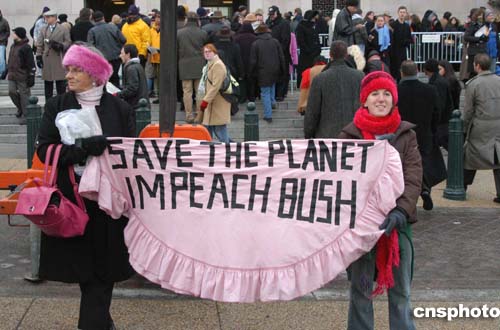 當(dāng)?shù)貢r(shí)間一月二十日,在美國總統(tǒng)布什就職典禮場外,一些示威者抗議布什當(dāng)政,要求彈劾總統(tǒng)。作者:余東暉