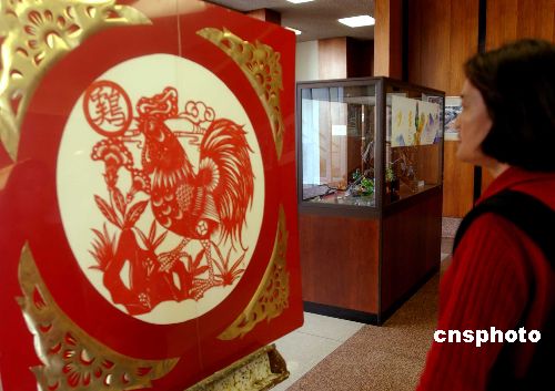 中國傳統(tǒng)農歷雞年藝術品一月開始在美國洛杉磯阿罕布拉市政廳展出,這里已成為華人新移民聚居的城市。作者:賈國榮