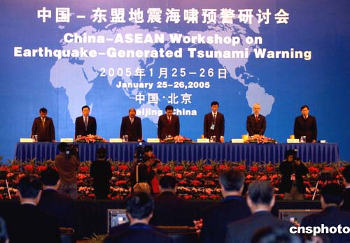 中國地震局國際合作司司長朱世龍主持開幕式。會議正式開始前,全體與會代表起立,為印度洋地震海嘯死難者默哀一分鐘。