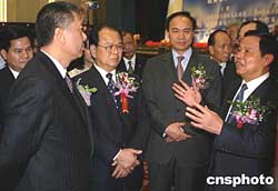 澳門特首何厚鏵一月二十六日訪問廣西,尋求加強(qiáng)合作的新途徑。二00四年,澳門在廣西投資項(xiàng)目共二百八十七個(gè),合同金額二點(diǎn)九四億美元,實(shí)際投資金額二點(diǎn)六五億美元,在投資廣西的國(guó)家和地區(qū)中,澳門的合同金額和實(shí)際投資金額均排第八位。圖為廣西自治區(qū)政府主席陸兵(右一)在向何厚鏵先生介紹情況。作者:蔣雪林