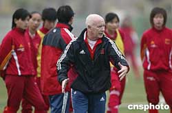 一月二十九日,中國(guó)女足在泉州對(duì)陣對(duì)陣德國(guó)隊(duì)前進(jìn)行訓(xùn)練。圖為中國(guó)女足技術(shù)顧問(wèn)基斯·布倫特向女足隊(duì)員講解戰(zhàn)術(shù)。作者:盛佳鵬
