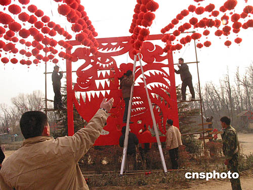 二月一日,一幅直徑四米的中國剪紙《吉祥如意圖》在河南鄭州搭建完畢。這是為2005春節(jié)商城民俗文化廟會主會場而建。該剪紙根據(jù)中國傳統(tǒng)剪紙技法、經(jīng)過三天的時間精心設(shè)計(jì)制作出來的,在歷年同類廟會中,該圖最大。春節(jié)廟會結(jié)束后將申請吉尼斯世界記錄。作者:慎重