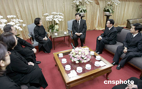 孫亞夫、李亞飛今天下午抵達(dá)臺北,四點(diǎn)三十五分前往靈堂吊唁辜振甫先生。圖為吊唁后與其家人座談。(臺灣海基會故董事長辜振甫先生治喪工作小組提供)中新社記者:邢利宇