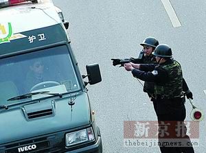 春節(jié)期間,為加強對金融單位的保護,北京市公安局進行了一次攔截被搶運鈔車的演習。下午1時30分左右,左安門橋下的南二環(huán)向西的主路上,車流如梭,一輛綠色的北京振遠護衛(wèi)運鈔車在車流中見縫插針地飛速前行,三四輛警車緊隨其后,旁邊的車輛很快讓出路來。看見幾個路口全部有警方布控后,運鈔車繼續(xù)朝前“逃竄”,并從開陽橋往北,駛向菜市口大街。