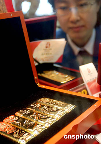首套“北京奧運(yùn)金”由第29屆奧林匹克運(yùn)動(dòng)會(huì)組織委員會(huì)授權(quán),中國(guó)印鈔造幣總公司與中國(guó)金幣總公司聯(lián)合發(fā)行,中國(guó)印鈔造幣總公司鑄造,中國(guó)銀行、中鈔國(guó)鼎(北京)投資有限公司擔(dān)任總經(jīng)銷。中國(guó)印鈔造幣總公司相關(guān)負(fù)責(zé)人介紹說,“北京奧運(yùn)金”的成色為99.99%,按重量分為4種規(guī)格,分別為50克、100克、500克和1000克,價(jià)格為135元/克。