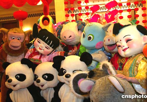 走進(jìn)張燈結(jié)彩的人民大會(huì)堂,噴泉涌動(dòng),鮮花爭(zhēng)艷,迎面兩個(gè)賀歲的“阿福”擁著“壽星”向人們恭賀新喜,彩燈閃爍的“!弊直磉_(dá)著新春的祝福。大型充氣“雞型”、“龍型”滑梯和“燈籠”、“蘑菇”城堡成了孩子們的樂園。