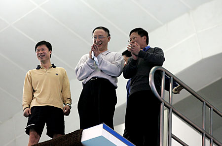 劉鵬一行來(lái)到跳水館后,首先在水池旁一邊觀看隊(duì)員訓(xùn)練,一邊與國(guó)家跳水隊(duì)領(lǐng)隊(duì)周繼紅等交談,了解了跳水隊(duì)春節(jié)期間訓(xùn)練的情況。對(duì)跳水隊(duì)春節(jié)期間堅(jiān)持訓(xùn)練的奮斗作風(fēng),劉鵬局長(zhǎng)非常滿意。他贊揚(yáng)了國(guó)家跳水隊(duì)春節(jié)期間放棄休息堅(jiān)持訓(xùn)練的精神,并高度評(píng)價(jià)了國(guó)家跳水隊(duì)“幾十年來(lái)經(jīng)久不衰”的優(yōu)秀運(yùn)動(dòng)成績(jī)。
