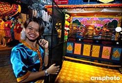 15日晚的泰國(guó)布吉島一旅游點(diǎn)上,一位小老板正在笑迎客人。海嘯地震過(guò)后,這里旅游業(yè)正在逐步復(fù)蘇。作者:宋吉河
