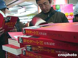 美國人羅伯特.勞倫斯.庫恩博士所著的《他改變了中國:江澤民傳》,春節(jié)之前一面市便受到廣大書友的追捧。圖為2月17日北京西單圖書大廈內(nèi)幾位讀者正在聚精會神地看書。作者:納夢月