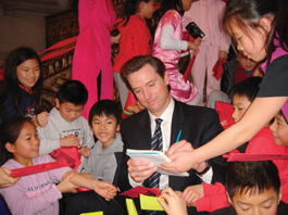 來自尤方玉屏中文學(xué)校的數(shù)十位小學(xué)生成為慶會的另一亮點,這些滿臉稚氣的學(xué)童,排排坐在通往二層的樓梯上,簇擁著年輕英俊的紐森市長,就像遇到偶像明星一樣,紛紛向他索要簽名。