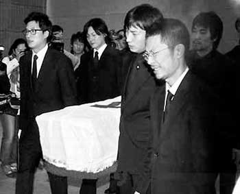 7時30分左右,文根英代表參加告別儀式的電影人宣讀了追悼詞———“善良、誠實(shí)的你就像火花一樣一閃而過,就這樣永遠(yuǎn)離開了我們……你的笑容和你的聲音、你的一舉一動都會留在我們的心中……你帶著最美好的回憶和美麗的心,安心地走吧……”接著是由池成朗讀了韓國著名詩人的悼念詩。最后,李恩珠生前好友BADA和歌手全仁權(quán)分別通過歌聲來追悼故人,通過歌曲表達(dá)了無比的悲痛和遺憾。BADA現(xiàn)場演唱了李恩珠平時最喜歡的頌歌,這時參加儀式的所有人開始給李恩珠獻(xiàn)花,為故人的靈魂祈福,愿她一路走好。