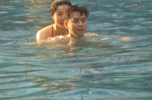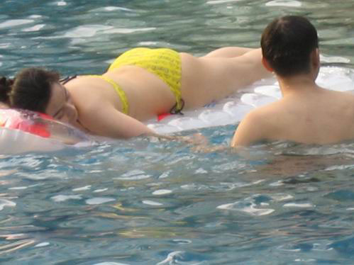王學(xué)兵于范冰冰現(xiàn)現(xiàn)身海南三亞銀泰獨家酒店的室外游泳池,隨行的還有一男一女兩位友人。此時泳池的游客比較稀少,范冰冰毫不吝惜身材,身穿性感的黃色兩件套比基尼入水,而一向缺乏時尚觸覺的王學(xué)兵則沒有選擇正規(guī)游泳褲,而是穿著深灰色沙灘褲便與范冰冰在水中展開嬉戲。除了酒店房間提供的沙灘毛巾外,兩人還另外租借了一張用以休息的水上氣墊床。