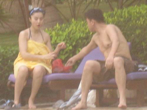 不多時已有游客發(fā)現(xiàn)身為明星的兩人,并以“不過如此”和“發(fā)福”來形容范冰冰和王學(xué)兵的身材,甚至舉起手中的相機意欲拍照。兩人迅速彈開,各自游到泳池的兩頭,范冰冰甚至還舉起手擋住鏡頭,示意游客不要拍照。而隨行的友人也相當(dāng)識趣的充當(dāng)起“耳目”,寧可不游泳留在躺椅上為兩人“把風(fēng)”。